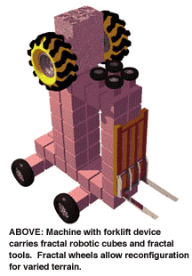 Fractal Robots are programmable machines that can do unlimited tasks in the physical world, the world of matter. Load the right software and the same "machines" can take out the garbage, paint your car, or construct an office building, and later, wash that building's windows.