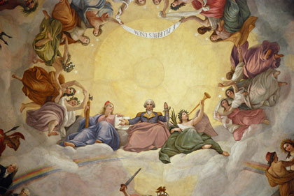 In light of the Great Perfection tradition, it is eye opening to observe that George Washington is portrayed on the rainbow throne of Glory and surrounded by 13 star maidens in the painting The Apotheosis of George Washington in the Dome of the U.S. Capitol. Constantino Brumidi painted this icon in 1865. He surely knew the inspiring words to the Battle Hymn having spent the Civil War years painting in the Capitol.