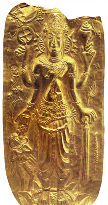 Vishnu. Eighth century. (Museum Nasional, Jakarta) Vishnu here is represented as a handsome youth in the attire of an ancient king. He is seen in necklaces, a bejeweled waist belt and a high royal crown. Vishnu holds the discuss, symbol of the mind. In the lower right hand he holds the mace, symbol of primeval knowledge. In the upper left hand which represents the tendency towards dispersion and liberation, Vishnu holds the conch, symbol of the five elements.