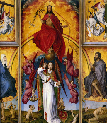 Jesus on the ark or rainbow throne of glory. Archangel Michael holds the scales