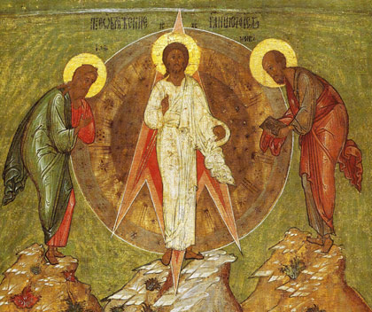 In Christian art the transfigured Jesus glows with rays or waves of glory. This celestial garment or ‘light body’ is thought of as a conveyor of the soul to the realm (or dimension) of light. Indeed, the light behind Jesus in Transfiguration art resembles a portal or a vortex. Moses and Elijah appeared beside Jesus. While he spoke with them a bright cloud cast a shadow over them. God spoke from the cloud. Terrified, the disciples fell prostrate. But Jesus came and touched their soul, saying, “Rise and do not be afraid” (Matthew 17:7).