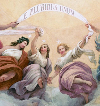 George Washington on the Rainbow of Glory in front of the sun (star) gate. Two of the star maidens hold a ribbon inscribed E. Pluribus Unum (“Out of many. One.”). This is the name of the spiritual republic of free souls