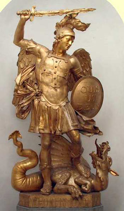 Michael the archangel, dressed somewhat like a Roman soldier, about to slay the devil (in the form of a dragon) with a fiery sword. He has a shield with the Latin phrase QUIS UT DEUS? "Who is like unto God?", which is a literal translation of the Hebrew name Mi-Ka-'El
