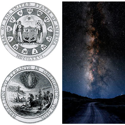 Thomas Jefferson’s proposal for the first seal of the United States of America. Drawing by Benson Lossing (1854). Astronomically, the pillar of cloud and pillar of fire is the Milky Way. During summertime, the Milky Way stands erect on the horizon and forms a ‘Stairway to Heaven’ or Jacob’s Ladder. The Mayans tell us the Cosmic Pillar will align with earth in 2012